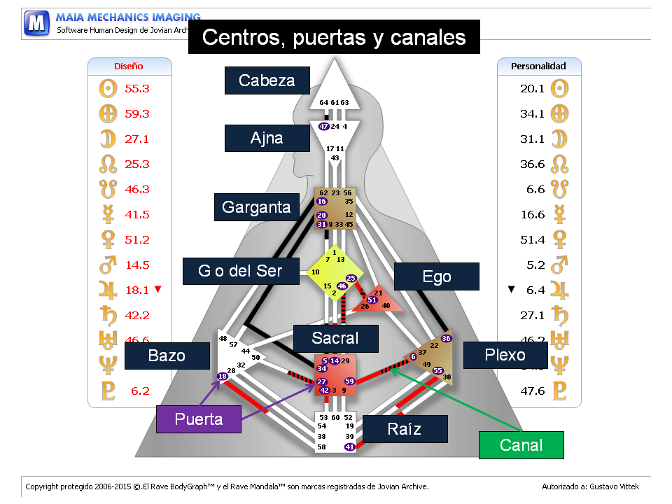 Los centros pueden estar definidos (en color en el gráfico) o no definidos (en blanco en el gráfico) y se interconectan a través de los canales y cada canal tiene una puerta en cada extremo. En el gráfico vemos que hay dos canales definidos: 59-6 y 20-34. Cuando un canal se define, los centros que comunica ese canal se definen también.